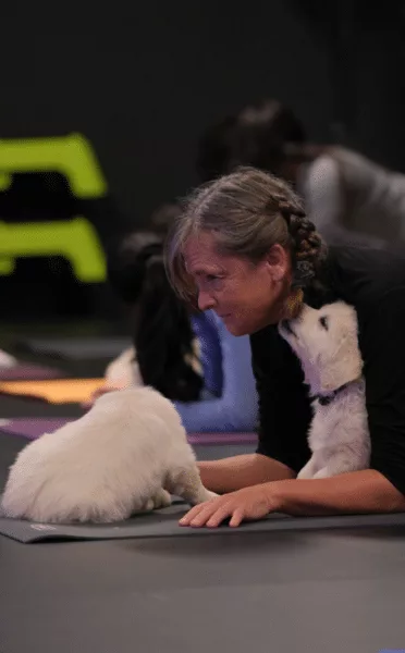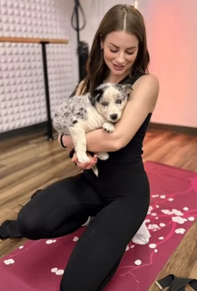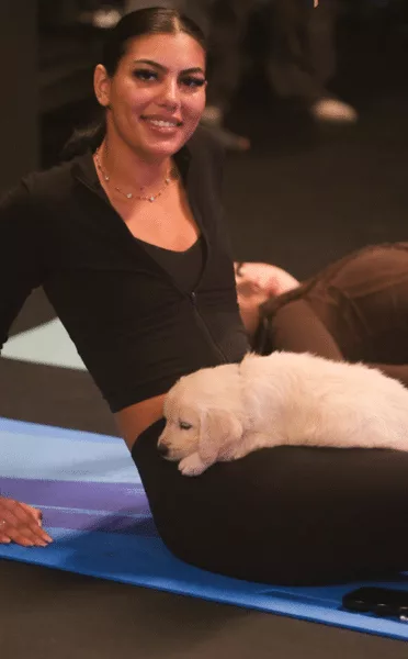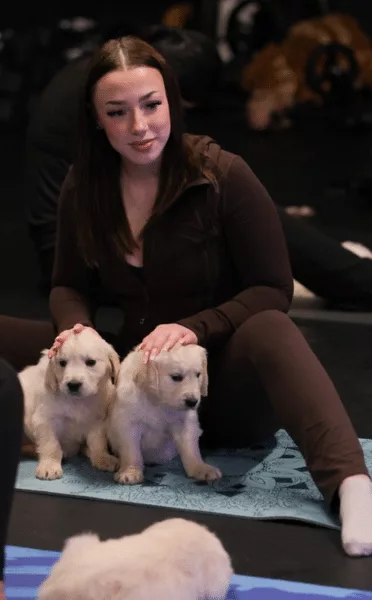Puppy yoga is exactly what it sounds like! A feel-good yoga class where playful pups roam freely as you flow through gentle, beginner-friendly stretches. At Stretch & Fetch, it’s not about perfect poses; it’s about laughs, connection, and tail wags. It’s the perfect combo of movement, mindfulness, and puppy love.